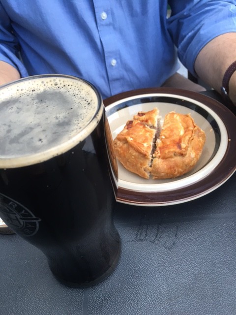 There was so much choice that I really couldn’t decide what to try and so the landlord suggested a tasting platter, with three small beers, one third of a pint each, served on a lovely wooden platter.  Rod decided to try the award winning pork pie, which lasted all of 30 seconds, and it won’t be our last visit.